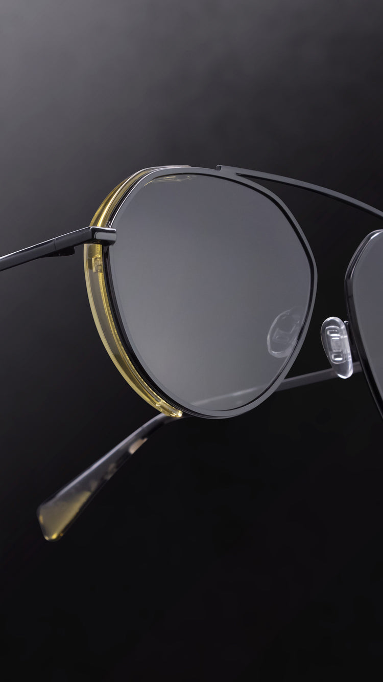 A fresh update on a classic pilot, the Sunset exudes style with its urban flair, high quality design and elevated details. Boasting a lightweight metal construction, the innovative geometric front profile is juxtaposed acetate blinders and laminate temple tips, resulting in the perfect balance of materials. Finished with a floating brow bar and sleek tubed temples, this is a must have pair of shades that are guaranteed to be a conversation starter.